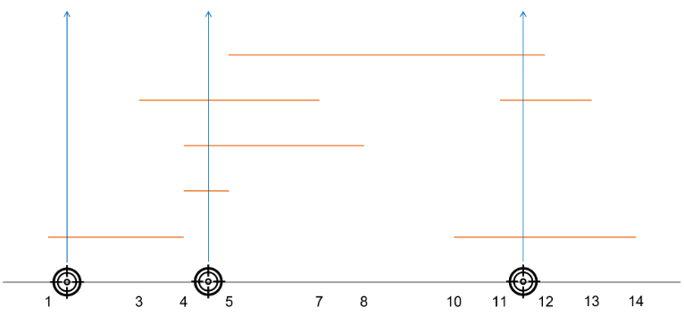 ํญ๊ฒฉ ๋ฏธ์ฌ์ผ ์ ์ ์(s, e) ๊ฐ ๋ฐฐ์ด๋ก ์ฃผ์ด์ง๋ค. ์ด์ ๋ง์ ์๊ฒฉ ๋ฏธ์ฌ์ผ์ ๋ฐ์ฌํ๋ ค๊ณ ํ ๋, ํ์ํ ์๊ฒฉ ๋ฏธ์ฌ์ผ ๊ฐ์์ ์ต์๊ฐ์ ๊ตฌํ๋ ๋ฌธ์ ์ด๋ค. ์ฌ๊ธฐ์ s, e๋ ์์ x์ขํ s, ๋ x์ขํ e๋ฅผ ์๋ฏธํ๋ค.